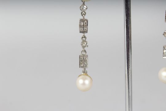 A PAIR OF 18CT WHITE GOLD, DIAMOND AND PEARL DROP EARRINGS.