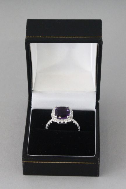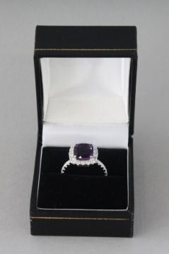 A GOOD 18CT WHITE GOLD, AMETHYST AND DIAMOND RING.