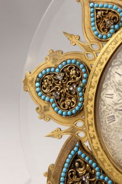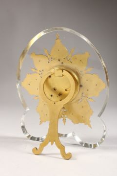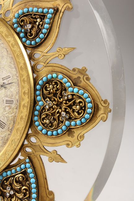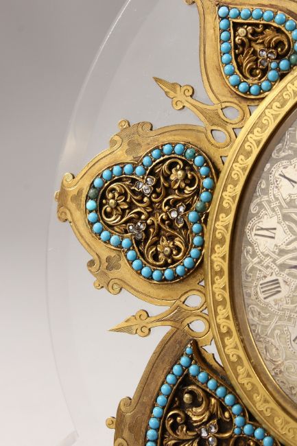 A SUPERB STRUTT CLOCK, on a shaped crystal frame, the oval dial with fine engraving, surrounded by seven various shapes with turquoise and diamond chips.