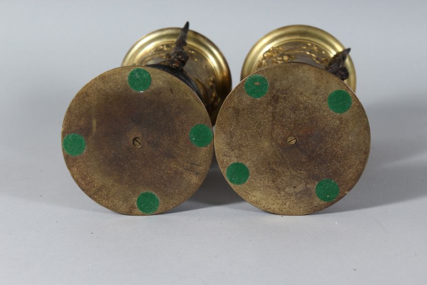 A PAIR OF CLASSIC BRONZE AND GILT BRONZE URNS on circular bases.
