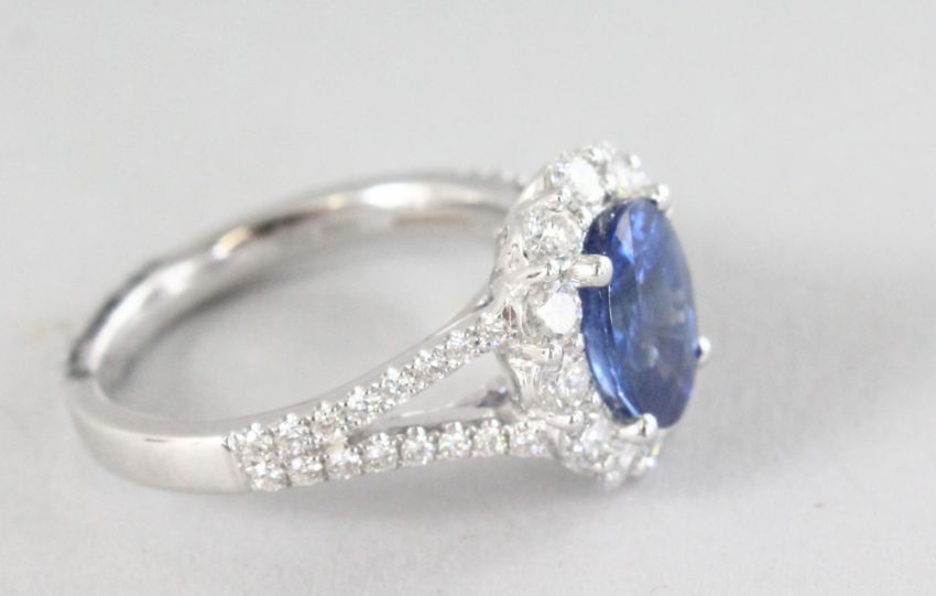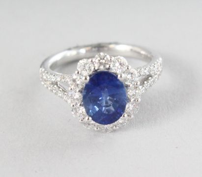A SUPERB 18CT WHITE GOLD AND SAPPHIRE RING, 2.26, surrounded by 0.99 carats of diamonds.