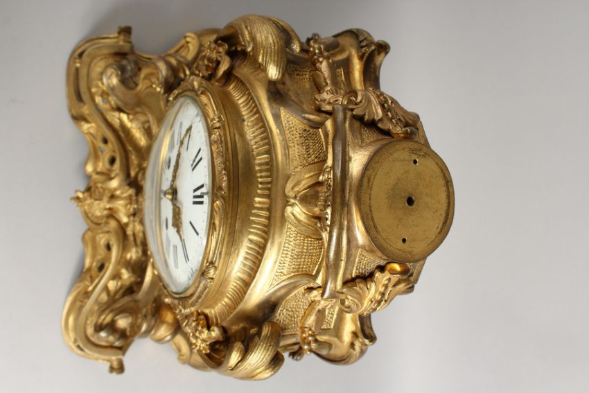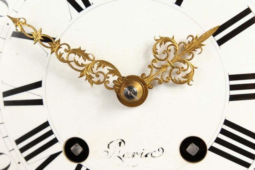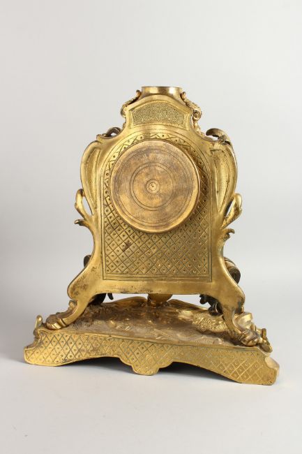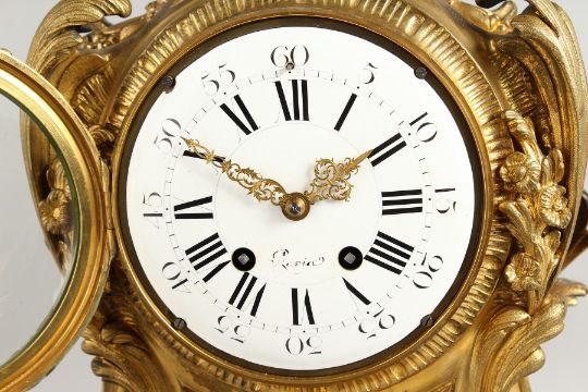A GOOD 18TH CENTURY FRENCH ORMOLU CLOCK by ROBLIN, PARIS, with black and white enamel dial, in a case with scrolls and musical trophies.