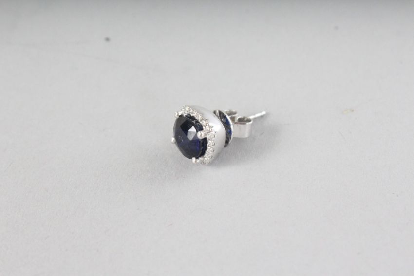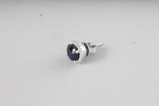 A SUPERB PAIR OF 18CT WHITE GOLD CUSHION SAPPHIRE, 4.51CTS, AND DIAMOND HALO EARRINGS, 0.26CTS.
