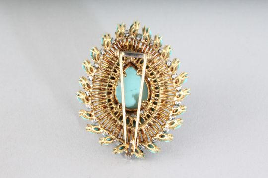 A SUPERB LARGE 18CT GOLD, TURQUOISE AND DIAMOND BROOCH, Possibly V.C.A.