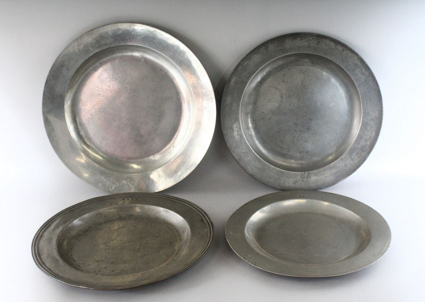 FOUR 17TH - 18TH CENTURY PEWTER CIRCULAR CHARGERS, one by Thomas King.