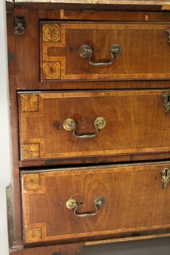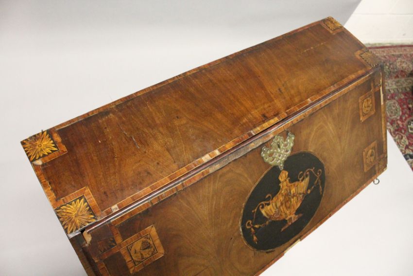 A GEORGE III MAHOGANY AND INLAID BUREAU, with a fall flap over three drawers, on bracket feet.