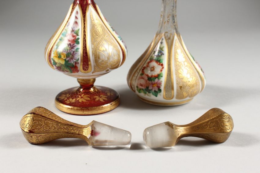 TWO BULBOUS OVERLAY SCENT BOTTLES AND STOPPERS, painted with flowers.