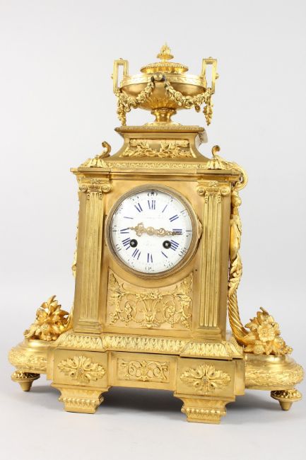 A VERY GOOD LOUIS XVI GILT ORMOLU MANTLE CLOCK, with white enamel dial, blue and white Roman numerals, Paris maker, the case with urn surmount, acanthus, scrolls and flowers.