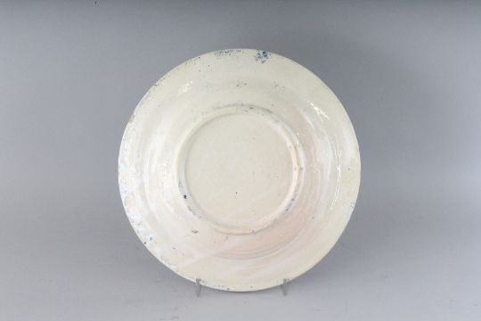AN EARLY SPANISH FAIENCE DISH in mainly blue and yellow.