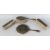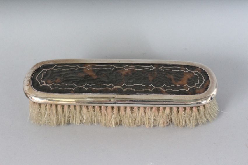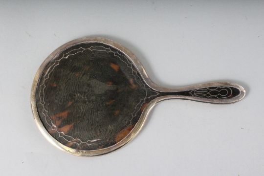 A SILVER AND TORTOISESHELL HAND MIRROR AND THREE BRUSHES.