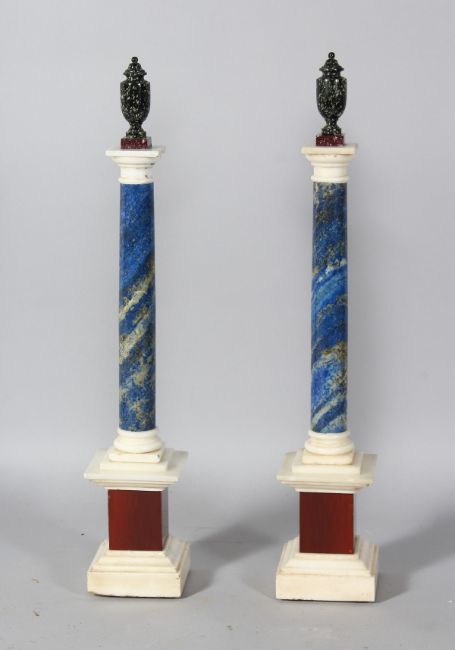 A FINE PAIR OF GRAND TOUR PIETRA DURA COLUMNS with Porphyry urn finials, on a black and white marble base.