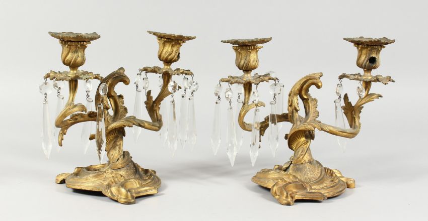 A GOOD PAIR OF ORMOLU TWO BRANCH LIGHTS with prism drops and acanthus mounts.
