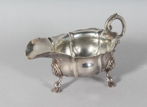 A GEORGE II CAST SILVER SAUCEBOAT, waved edge, crest, on three pad feet.