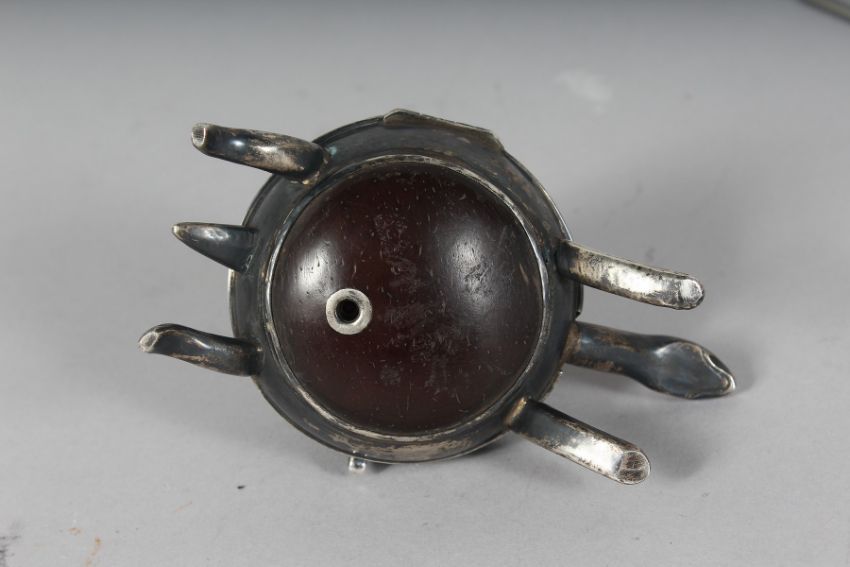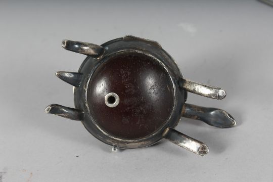 A RARE SILVER MOUNTED TORTOISESHELL "TORTOISE" SHAPED CLOCK, the lid opens to reveal the watch movement by THOS. BRODERICK, SPALDING, No. 2017.