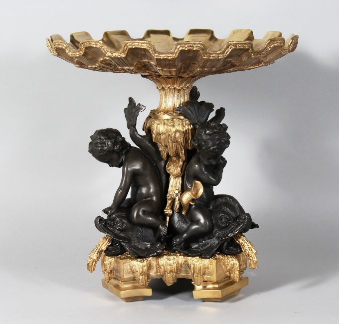 A GOOD BRONZE AND GILT BRONZE COMPORT with three cupids and dolphin support.