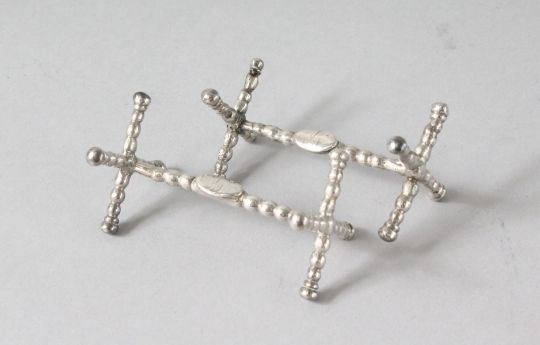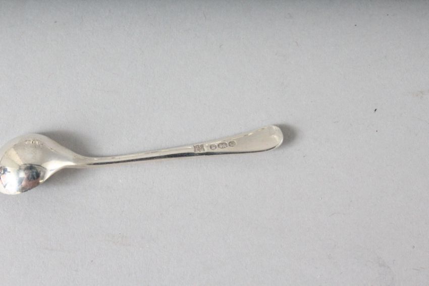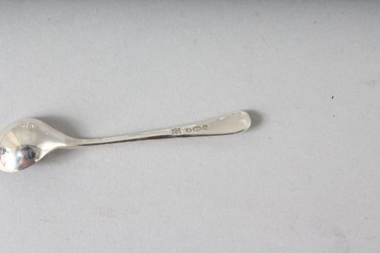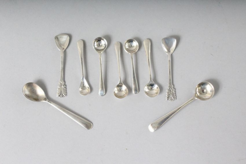 FOUR VARIOUS SALT AND PEPPERS, NINE SALT SPOONS AND A PAIR OF KNIFE RESTS.