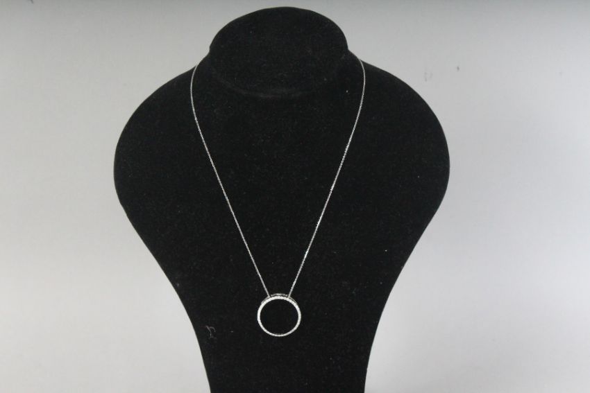 AN 18CT WHITE GOLD AND DIAMOND (0.39cts) CIRCLE PENDANT on a chain.
