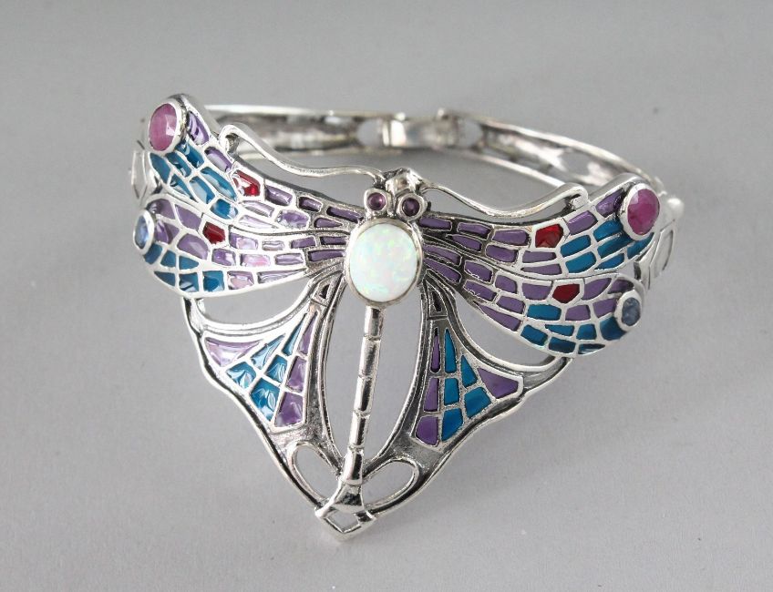 AN ART DECO DESIGN SILVER, OPAL AND SAPPHIRE DRAGONFLY BRACELET.