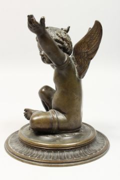 A GOOD BRONZE WINGED CUPID on a circular base.