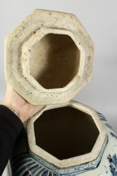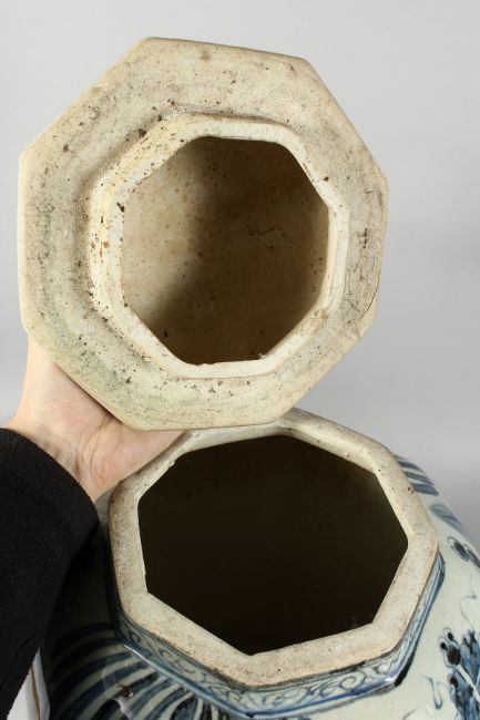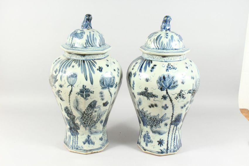 A PAIR OF 20TH CENTURY CHINESE BLUE AND WHITE BALUSTER SHAPE TEMPLE JARS AND COVERS, painted with fish.
