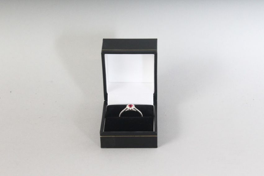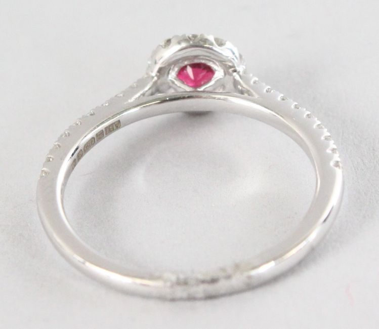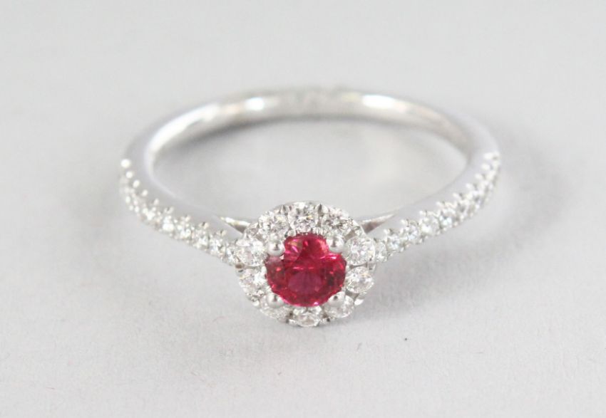 AN 18CT WHITE GOLD, ROUND SPINEL (0.32cts) AND DIAMOND (0.29cts) HALO RING.