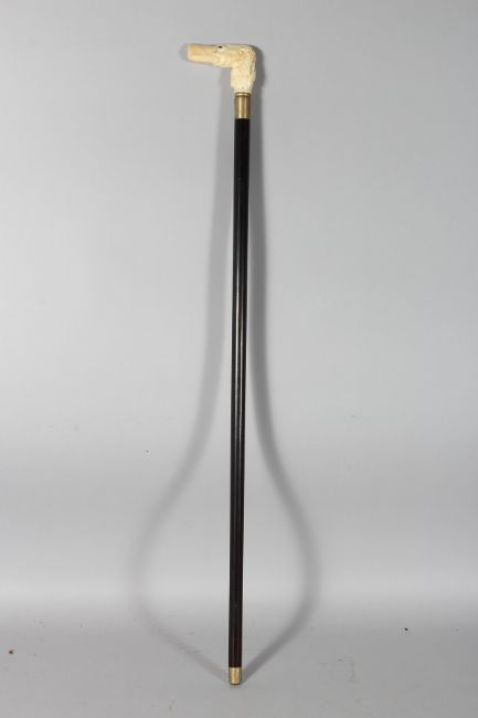 A CARVED BONE DOG HANDLE WALKING STICK.