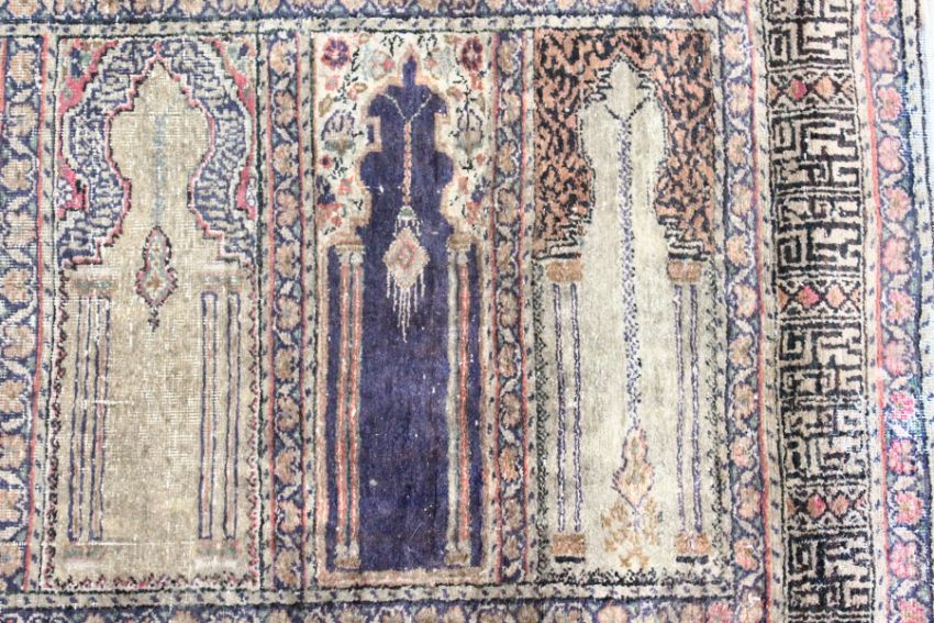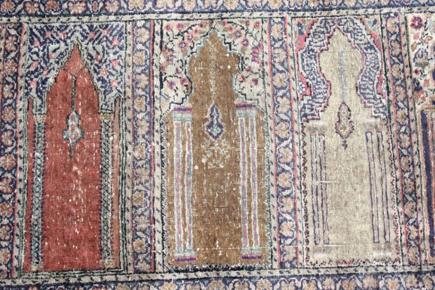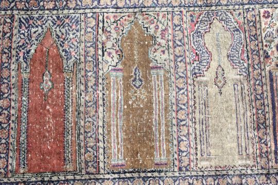 AN UNUSUAL PERSIAN PRAYER RUG, the central panel with eight arches and hanging lamps, within a geometric and floral border.