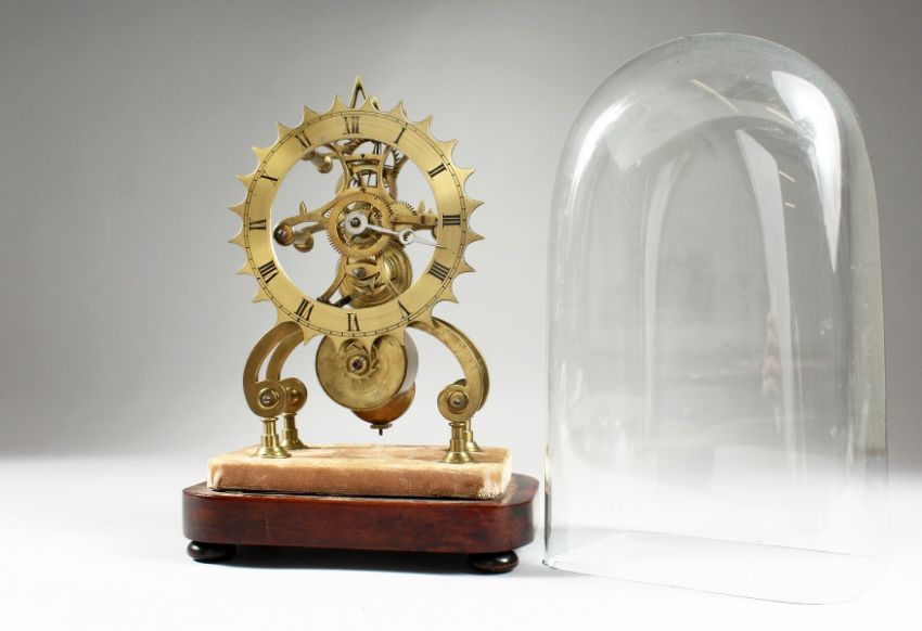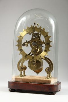 A 19TH CENTURY BRASS SKELETON CLOCK, eight-day movement, the cog shaped chapter ring with enamelled Roman numerals, in a glass case.