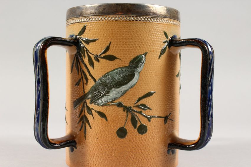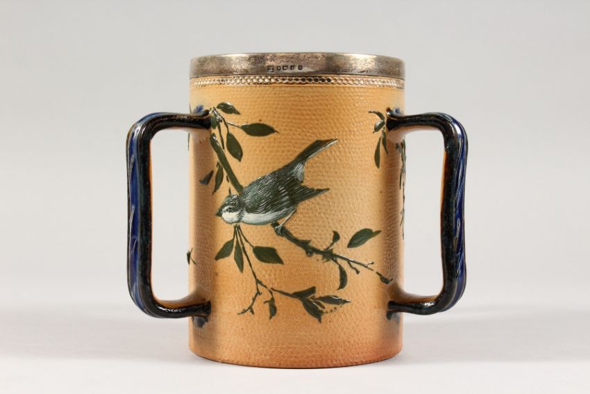 A GOOD DOULTON LAMBETH STONEWARE TYG by FLORENCE E. BARLOW decorated with birds.
