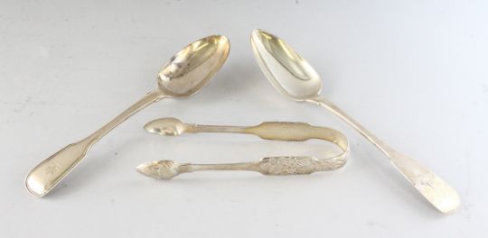A PAIR OF IRISH SUGAR TONGS, Dublin 1817, and TWO FIDDLE PATTERN TABLESPOONS.