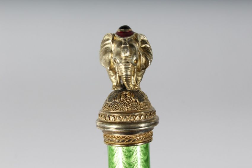 A SUPERB RUSSIAN SILVER GILT AND JADE PAGE TURNER with elephant finial.