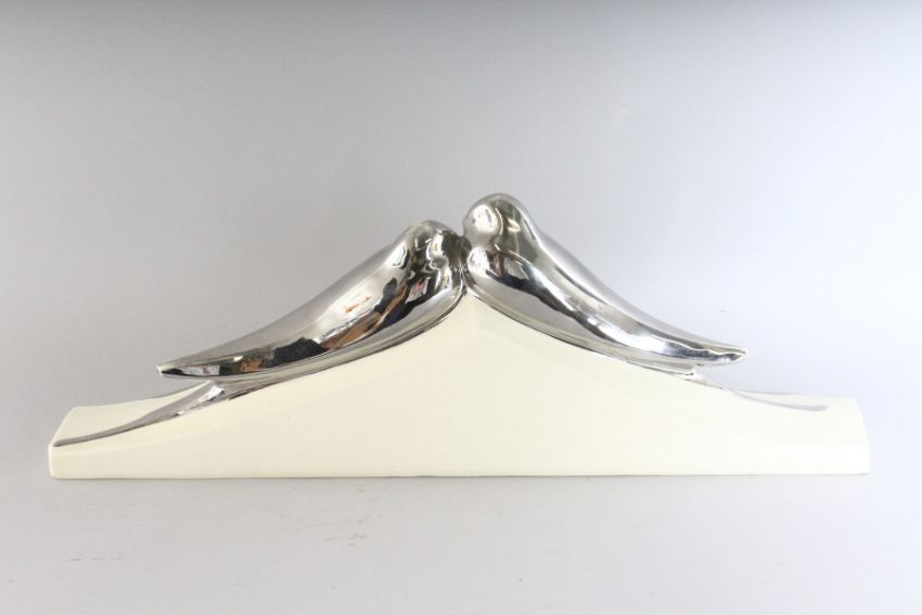 A LEJAN POTTERY GROUP with three silvered swallows and cream base, 1929.