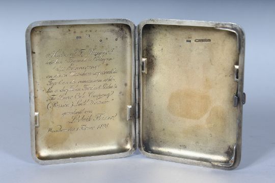 A RUSSIAN SILVER CIGARETTE CASE, with applied crest and inscription dated 1898.