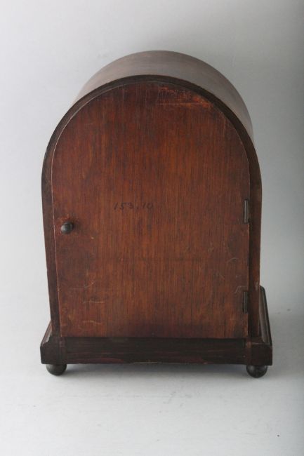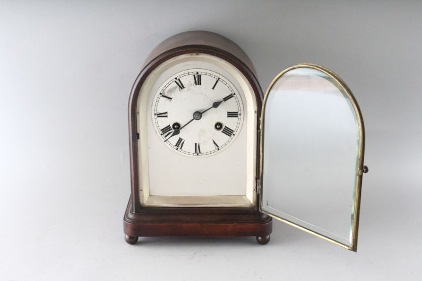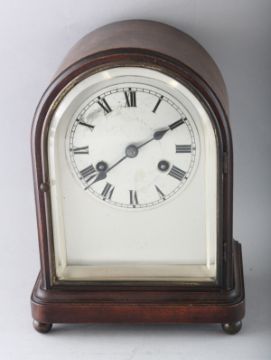 A 1930'S-1940'S MAHOGANY MANTLE CLOCK, with silvered dial on four bun feet.
