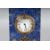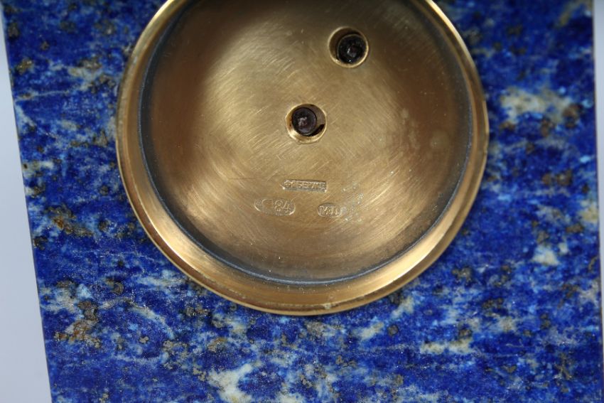 A SUPERB RUSSIAN FABERGE STYLE LAPIS AND SILVER CLOCK, with applied decoration, winged eagles and garlands.
