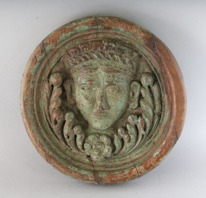 AN 18TH CENTURY CARVED WOOD ROUNDEL, carved with a head.