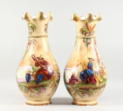 A LARGE PAIR OF LATE 19TH CENTURY CONTINENTAL PORCELAIN VASES, of baluster form with wavy rims, painted with oriental figures in a landscape (AF).