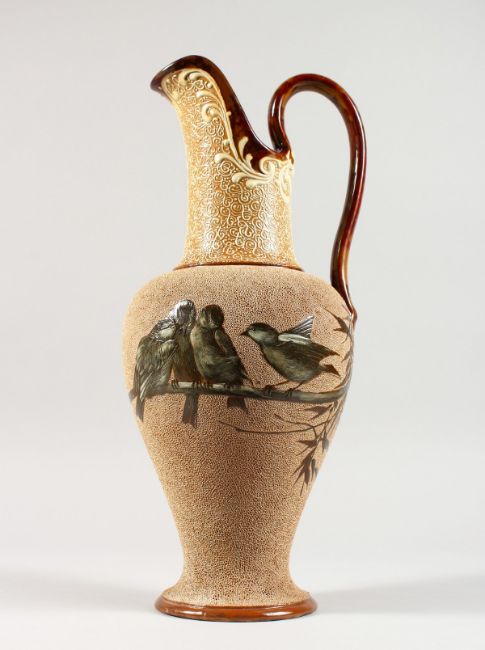 A SUPERB LARGE DOULTON LAMBETH STONEWARE JUG by FLORENCE E. BARLOW decorated with birds in brilliant colours.