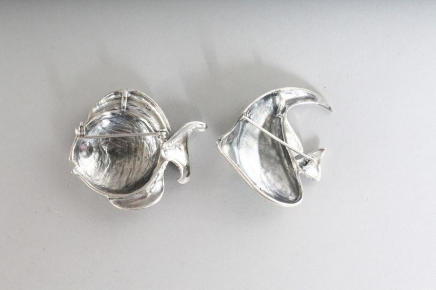 TWO SILVER AND ENAMEL FISH BROOCHES.