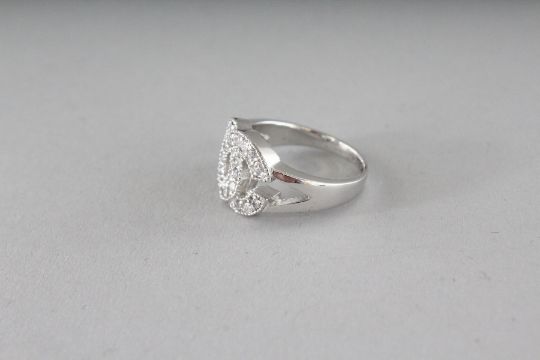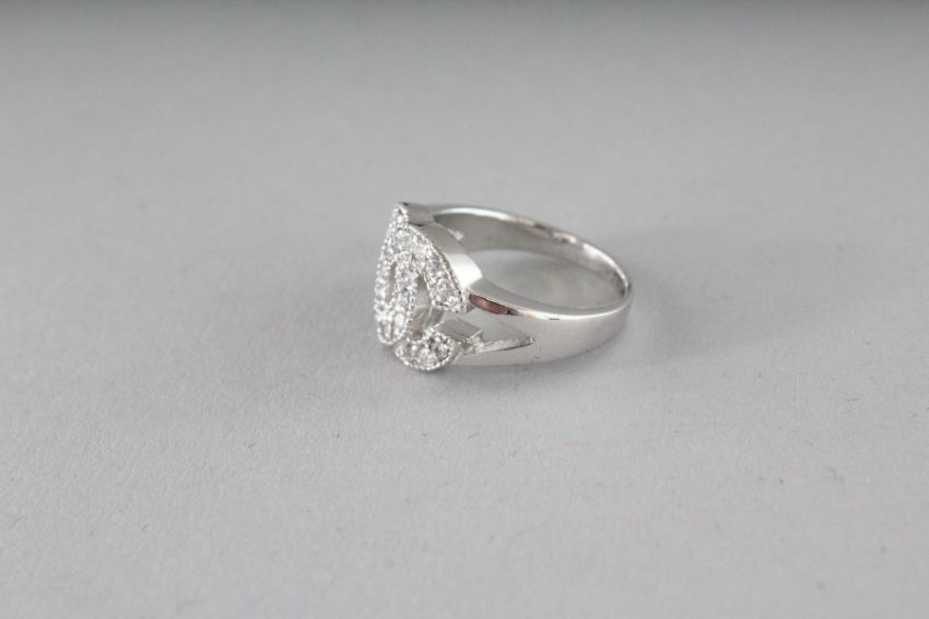 A CHANEL DESIGN SILVER AND CZ DOUBLE C RING.