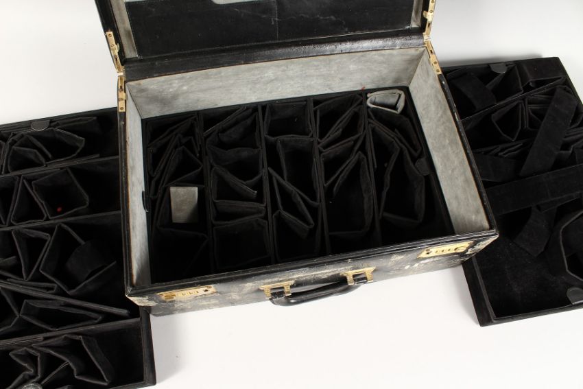 A MODERN BLACK LEATHERETTE BRIEFCASE with fitted interior.