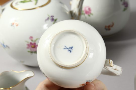 A GOOD MEISSEN PORCELAIN CABARET SET, white ground edged in gilt and sprigged with flowers, comprising tray, 18ins x 14.5ins, teapot, hot water jug, milk and cream jug.