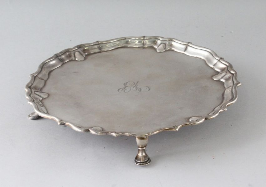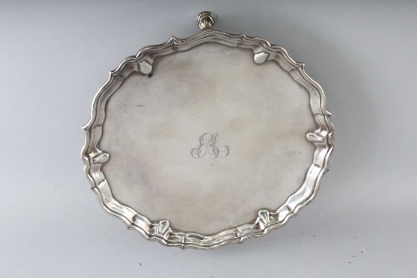 A GEORGE II PIECRUST SALVER on four pad feet.