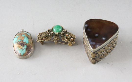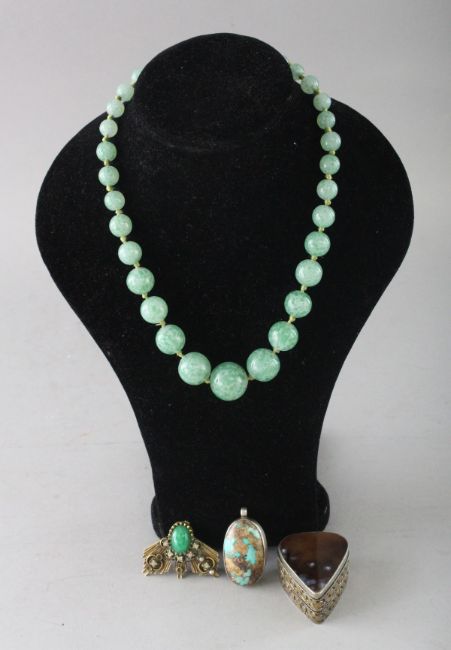 A HARDSTONE PENDANT, SNUFF BOX, BROOCH and GREEN STONE NECKLACE.