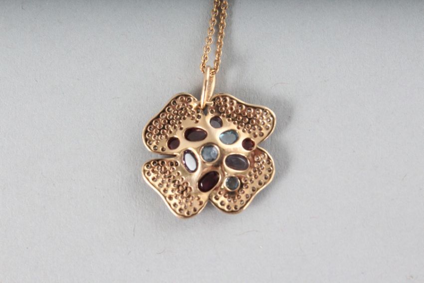 AN 18CT ROSE GOLD, SAPPHIRE (1.65cts) AND DIAMOND (0.69cts) FLOWER PENDANT on a chain.