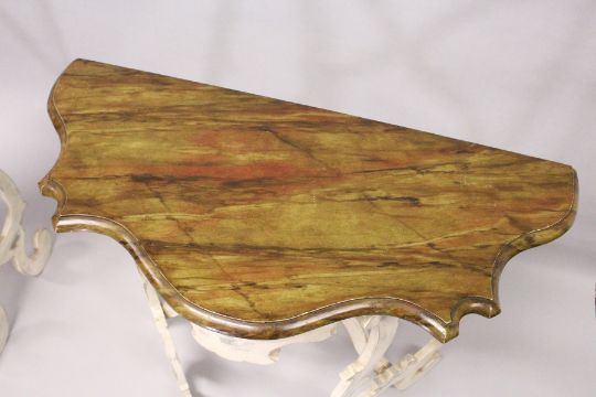 A PAIR OF GRAHAM CARR ITALIAN DESIGN PINE CONSOLE TABLES, 20TH CENTURY, with faux marble shaped tops, on painted curving supports.