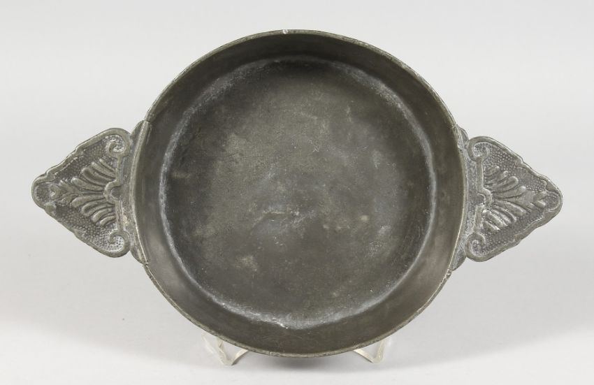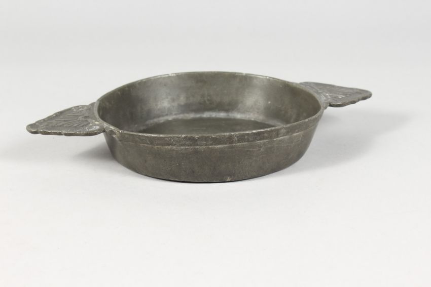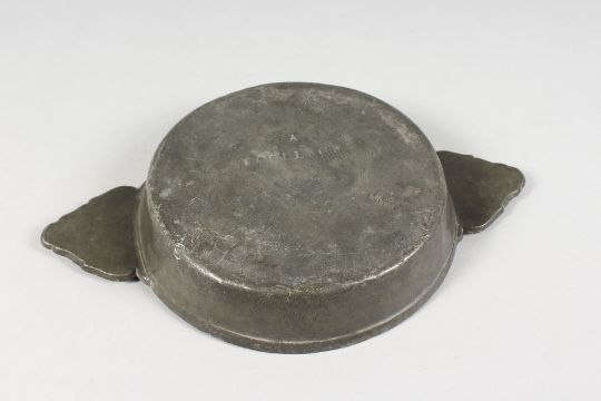 AN EARLY PEWTER CIRCULAR TWO-HANDLED QUAICH.