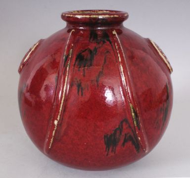 AN UNUSUAL JAPANESE FLAMBE GLAZED & MOULDED STUDIO POTTERY PORCELAIN VASE, 19.8cm wide, 20.3cm high.
