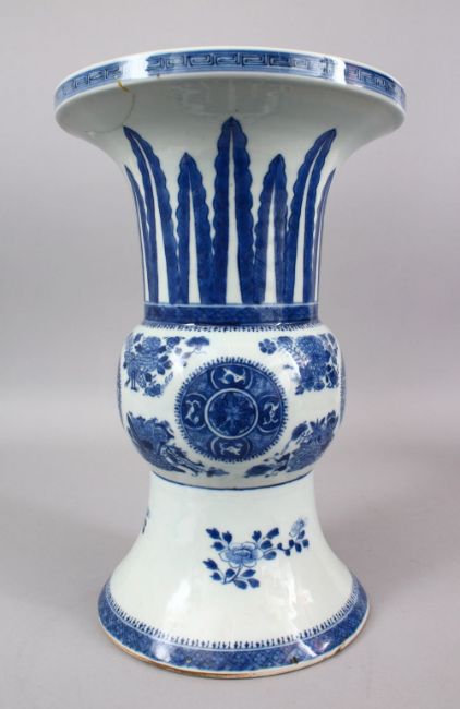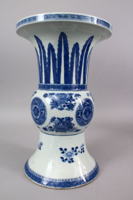 A LARGE CHINESE BLUE & WHITE QIANLONG STYLE PORCELAIN YEN YEN VASE, decorated with borders of lappet above precious object and floral motif display, 36cm high x 23cm wide.