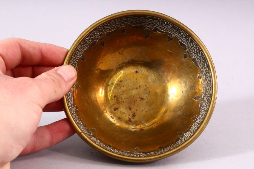 A SMALL ISLAMIC CIRCULAR BRASS BOWL with silver inlaid and engraved decoration, 13cm diameter.
